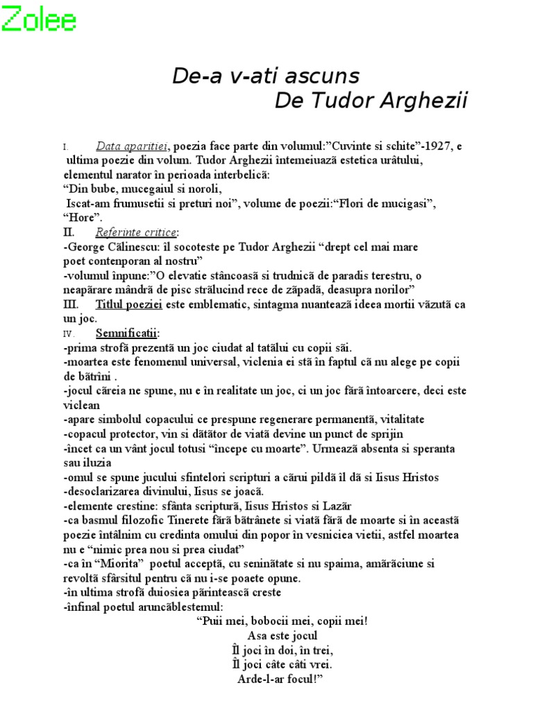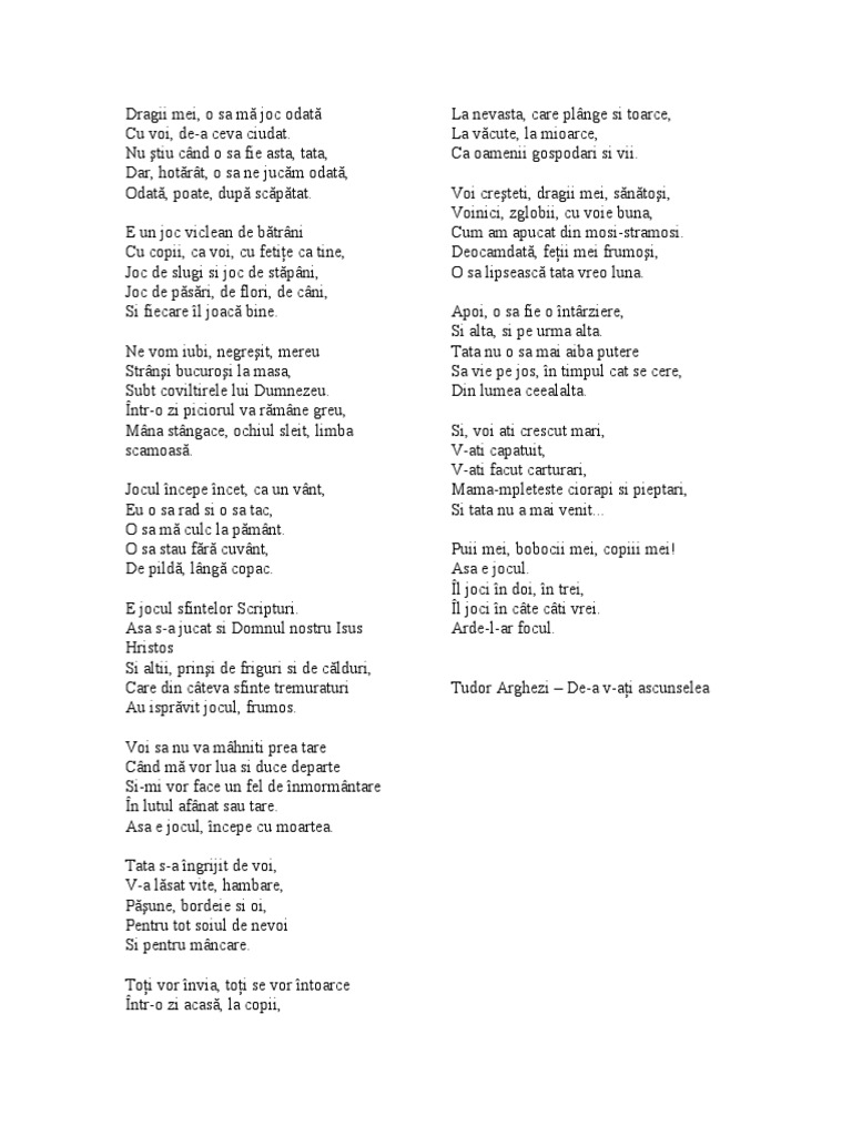 V ati capatuit v ati facut carturari mama mpleteste ciorapi si pieptari si tata nu a mai venit. De a v ati ascuns tudor arghezi. Creatia existenta dragostea moartea poezia sunt pentru poet ipostazele unui joc cosmic pe care fiecare il joaca om sau dumnezeu cu inocenta si naivitate. Contact email trimite o scrisoare catre editor.
