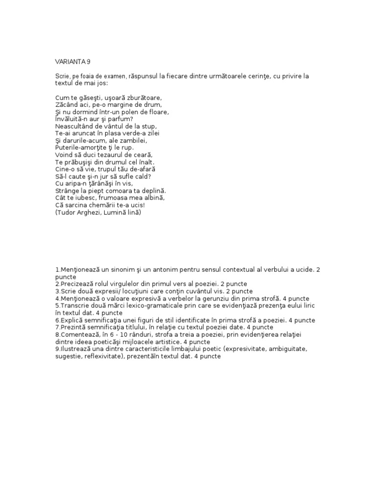 Poezia lumină lină este alcătuită din patru catrene strofe de câte patru versuri şi exprimă aspiraţia spre ideal spre absolut pentru a cărui împlinire artistul este capabil de sacrificiul suprem. Lucrare scrisă la limba și literatura română pe semestrul ii. 0 stele 0 review uri. De abia plecaseși de tudor arghezi.