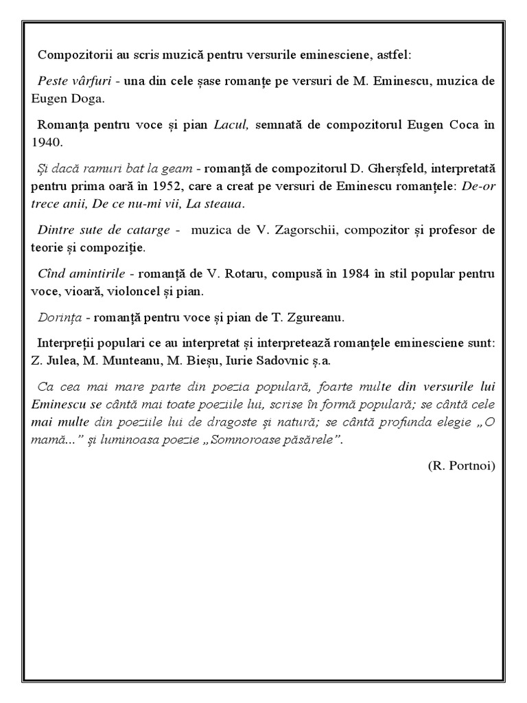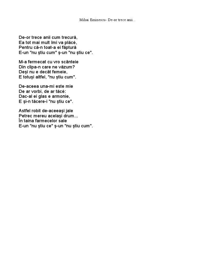 De aceea una mi este mie de ar vorbi de ar tăcé. De or trece anii cum trecură ea tot mai mult îmi va plăcea pentru că n toat a ei făptură e un nu ştiu cum ş un nu ştiu ce. Opera a fost concepută în epoca gazetăriei bucureştene având mai multe versiuni păstrate în forma a trei manuscrise. De or trece anii cum trecura ea tot mai mult imi va plac pentru ca n toat a ei faptura e un nu stiu cum s un nu stiu ce.