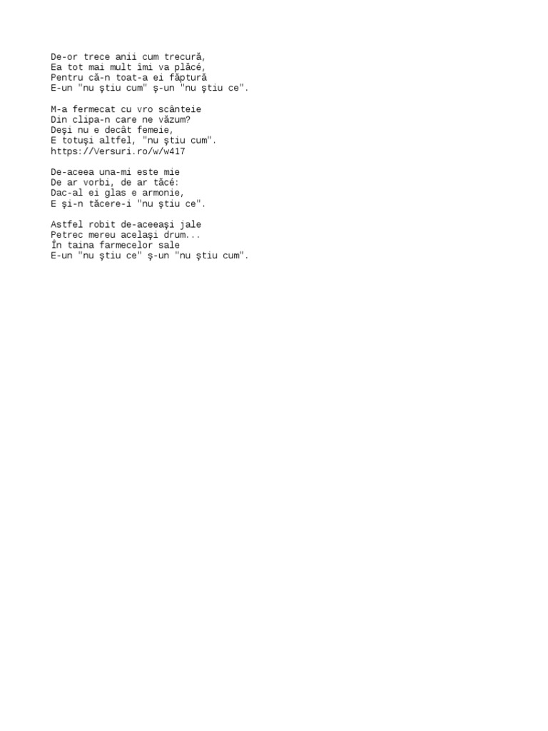 Dac al ei glas e armonie. M a fermecat cu vro scânteie din clipa n care ne văzum. De aceea una mi este mie de ar vorbi de ar tăce. De or trece anii cum trecură ea tot mai mult îmi va plăcé pentru că n toat a ei făptură e un nu ştiu cum ş un nu ştiu ce.