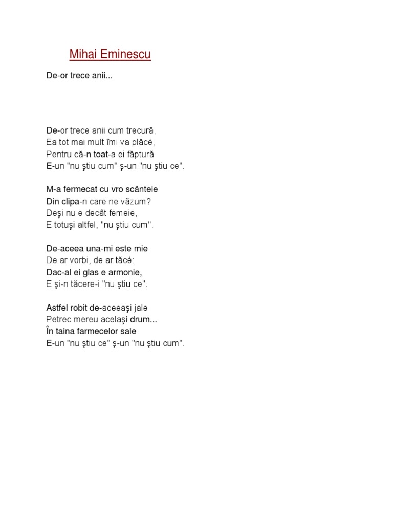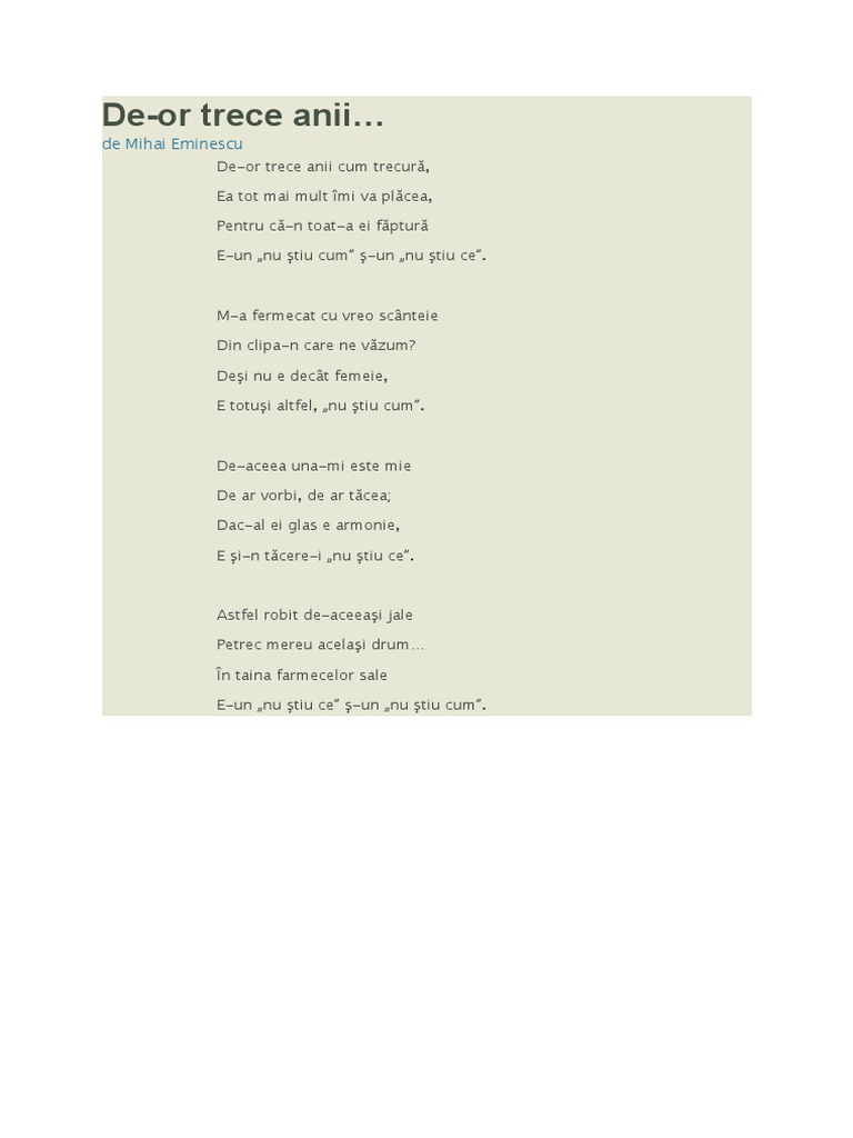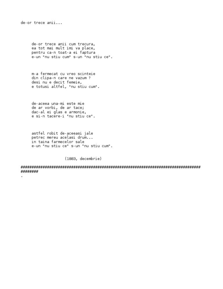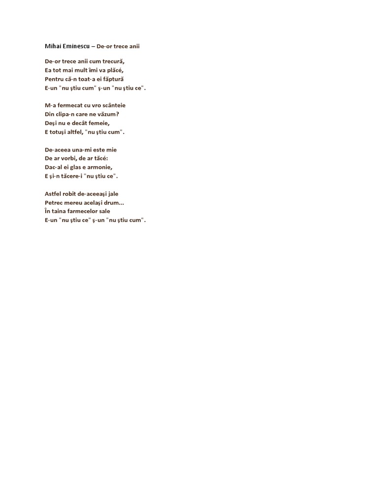 De or trece anii cum trecură ea tot mai mult îmi va plăcé pentru că n toat a ei făptură e un nu ştiu cum ş un nu ştiu ce. De or trece anii cum trecură ea tot mai mult îmi va plăcé pentru că n toat a ei făptură e un nu ştiu cum ş un nu ştiu ce. Dac al ei glas e armonie. M a fermecat cu vro scânteie din clipa n care ne văzum.
