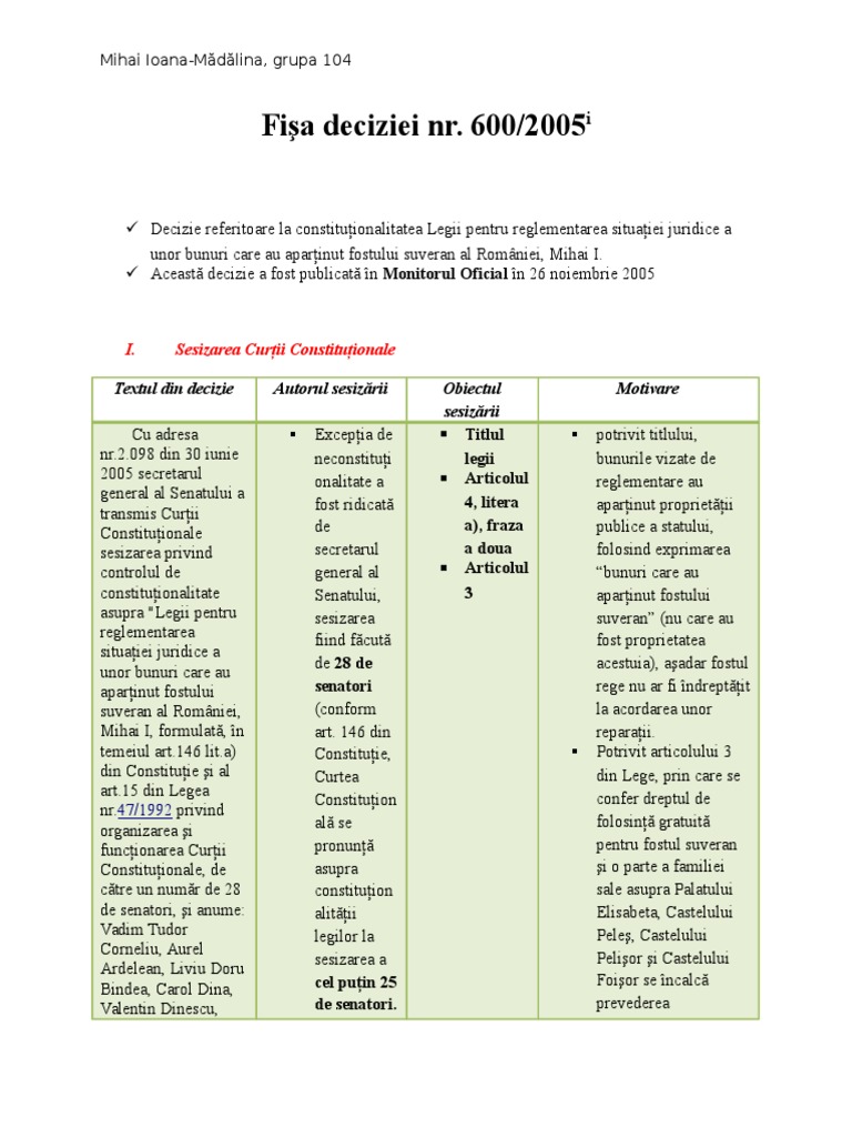 Ix din legea nr. 600 2005 cu privire la constituționalitatea legii pentru reglementarea situației juridice a unor bunuri care au aparținut fostului suveran al româniei mihai i modificări text publicat în monitorul oficial partea i nr. 1060 din 26 noiembrie 2005. 600 din 28 ianuarie 2005 pronunțată de secţia civilă şi de proprietate intelectuală a înaltei curți de casație și justiție î c c j iccj.