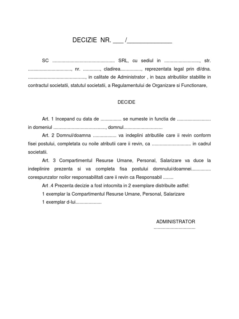 Decizie de numire in functie persoana desemnata model. Cuantumul primelor in functie de valoarea salariului completare adeverinta de vechime in munca. Pentru a descarca model decizie revisal click aici important click pe clopoțelul rosu din coltul ecranului stânga jos sau te rog sa dai accept in fereastra ce apare la intrarea pe site si abonează te la notificări. Atributiile legate de aceasta functie sunt cele prevazute in fisa postului. Decizie de numire persoana pentru completarea si transmiterea registrului general de evidenta a salariatilor.