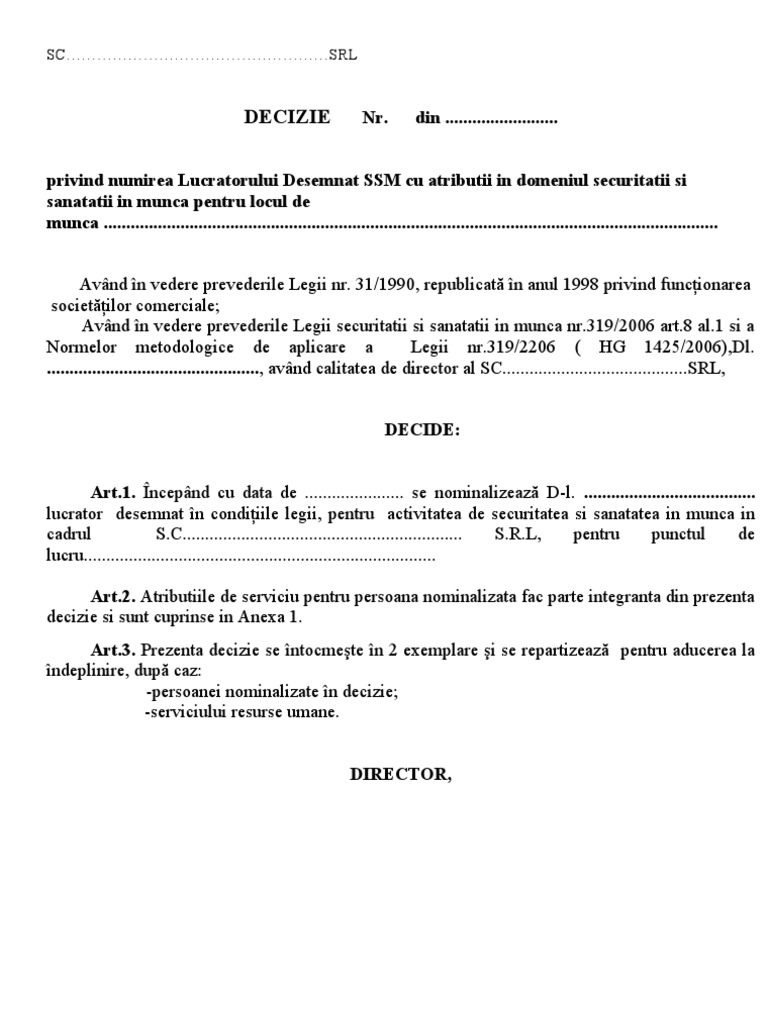 4 prezenta decizie se comunica salariatului si va fi dusa la indeplinire prin intermediul departamentului personal. Asadar registrul de evidenta a salariatilor revisal se compleaza si se transmite fie de persoana persoanele numite de angajator prin decizie scrisa fie de prestatorul de servicii inregistrat la inspectoratul teritorial de munca care a incheiat cu angajatorul un contract de prestari servicii. Pentru a verifica daca avem personal disponibil pentru a satisface nevoile firme d voastra va rugam sa ne apelati telefoni la numar de. Decizie numire responsabil de mediu lia sfercea rog cei ce au un model pentru decizia de numire responsabil de mediu sa mi o trimita si mie.