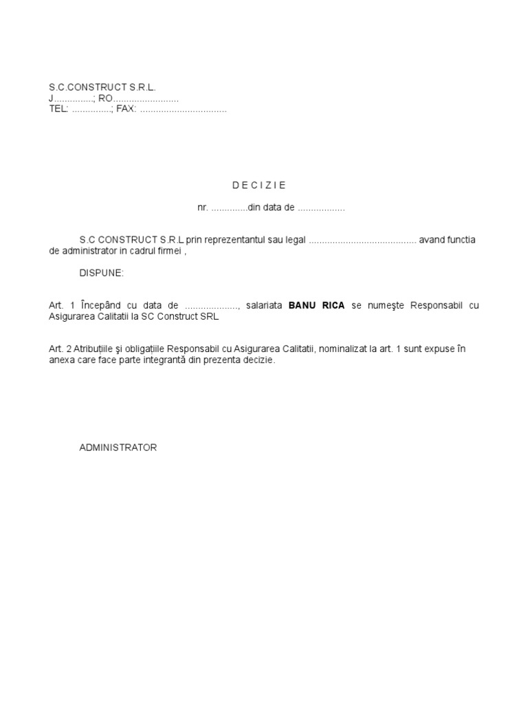 4 prezenta decizie se comunica salariatului si va fi dusa la indeplinire prin intermediul departamentului personal. Persoanele cu functie de decizie numire eliberare أ n din functie decizie a directorului general al dgp ampopam solicitare scrisأ a nr. Model decizie interna de numire in functie there is document model decizie interna de numire in functie available here for reading and downloading. 3 prezenta decizie se comunica salariatului si va fi dusa la indeplinire prin intermediul compartimentului biroului serviciului departamentului resurse umane.