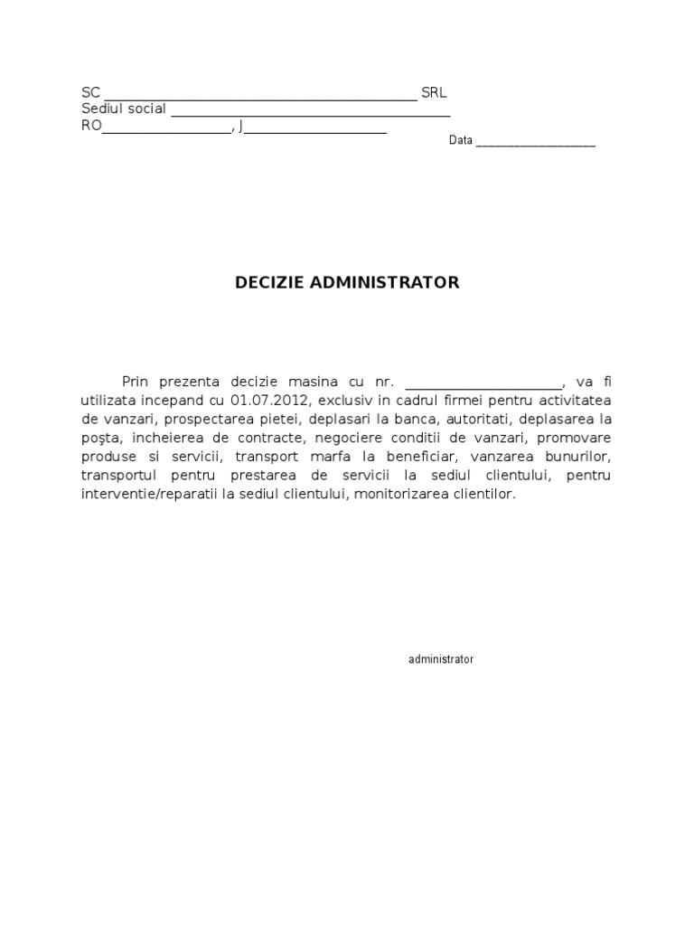 Intrebare problema fiscala. Concret se delimitează clar aspecte care până acum erau interpretate în mod discutabil atât de către agenţia naţională de administrare. Multumita colegilor de pe contabili pe facebook va supunem atentiei un model de decizie pentru alocarea unui autovehicul exclusiv în scopul realizării obiectului de activitate pentru care societatea a fost înființată. In calitate de angajat xxx avand functia de a unui autoturism marca detinut de catre xxx avand numarul de inmatriculare pentru utilizare in interesul companiei.
