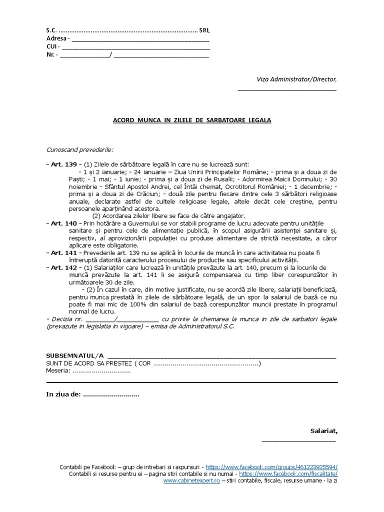 O companie care nu face parte din categoria unitatilor sanitare sau de alimentatie publica solicita angajatilor sa lucreze intr o zi de sarbatoare legala. Articolul precedent decizie pentru muncă în zilele de sărbătoare legală nominalizare salariați angajați precizare mod compensare model gratuit articolul următor sinteza săptămânii 29 05 2017 02 06 2017 documente necesare pentru munca în zile de sărbători legale avertismente controale alte info utile etc. Daca raspunsul este afirmativ exista vreun formular pentru munca in zilele de sarbatoare legala. Situatii financiare anuale pentru un contabil de nota 10.