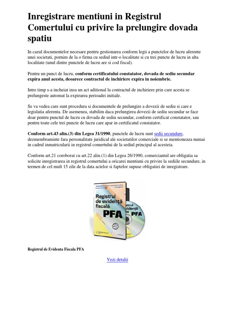 Punct lucru registru unic control sediu secundar omfp 1329 2004. Un depozit din care nu se vand marfuri trebuie declarat ca si punct de lucru stabilim baza legala si procedura de inregistrare a punctului de lucru. Vom vedea care este modul de depunere pentru declaratia 112 pe cod fiscal sediu punct de lucru si unde se platesc impozitul pe salarii si contributiile salariale in situatiile de mai sus. Contribuabilii care au organizate puncte de lucru stabile cu minimum 5 persoane care realizeaza venituri din salarii au obligatia sa solicite inregistrarea fiscala a acestora legea numarul 207 2015 articolul 85 alineatul 5 si legea numarul 273 2006 articolul 32 alineatul 7.