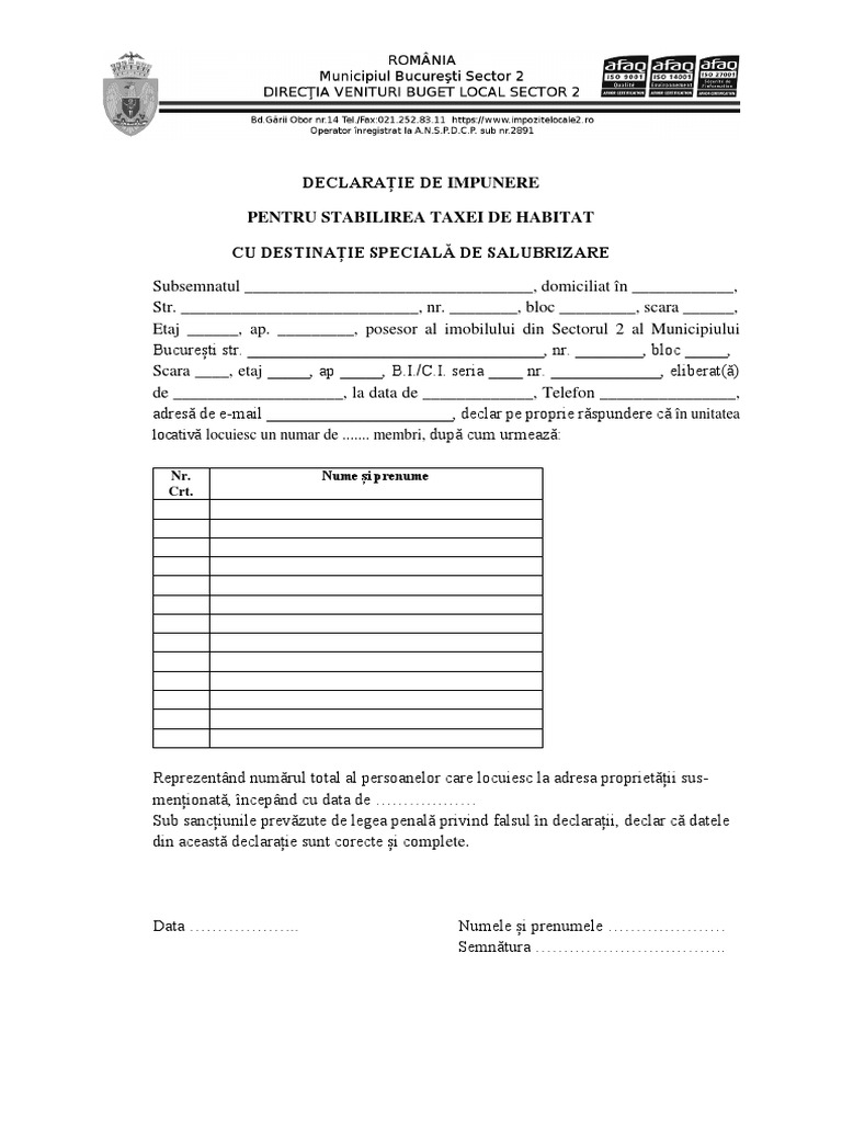 Declaratie De Impunere Pentru Stabilirea Taxei De Habitat Sector 2