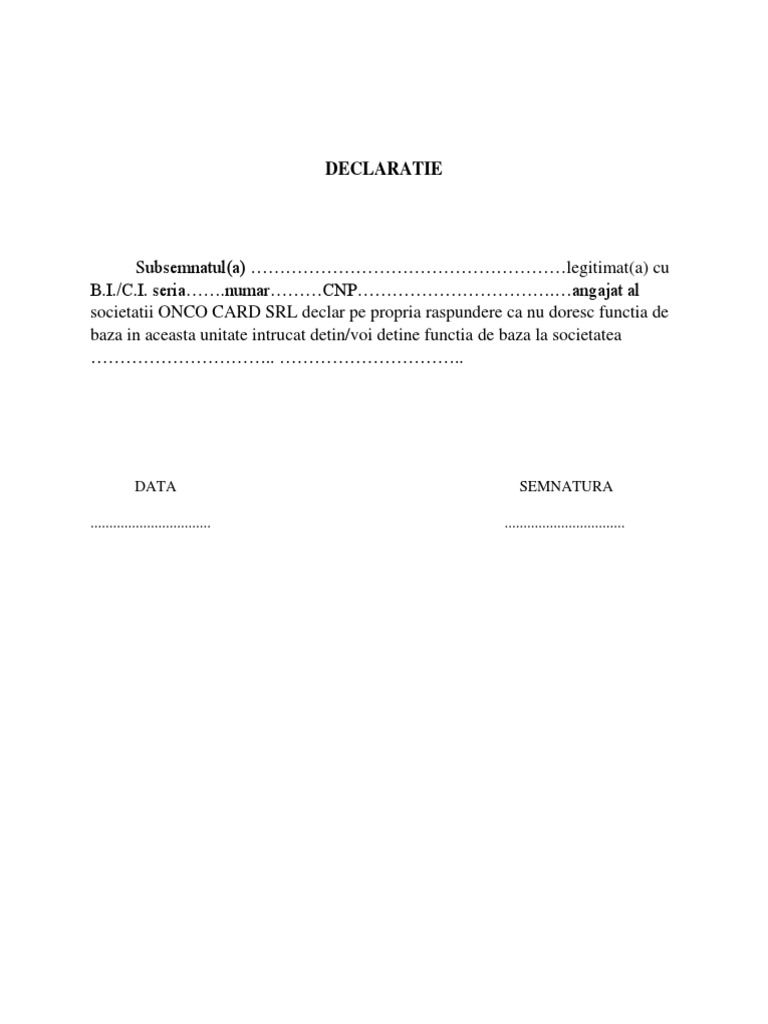 0 0 found this document useful mark this document as useful. Use the download button below or simple online reader. Declaratie pe propria raspundere in vederea acordarii de deduceri personale. Cand se completeaza declaratia functie de baza pentru un salariat.
