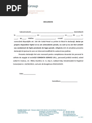 Secțiunea 1 nume ș. Declaratia proprie raspundere cazier judiciar ca nu ati suferit nicio condamnare completata si scanata pdf declaratia pe proprie raspundere adeverinta capacitate deplina pentru exercitarea profesiei completata si scanata pdf. Pentru textul integral alegeți un abonament lege5 care permite vizualizarea completă a documentului sau cumpărați documentul în formă completă. și mă angajez că voi prezenta certificatul de cazier judiciar valabil cel târziu până la susținerea probei de interviu sub sancțiunea descalificării.