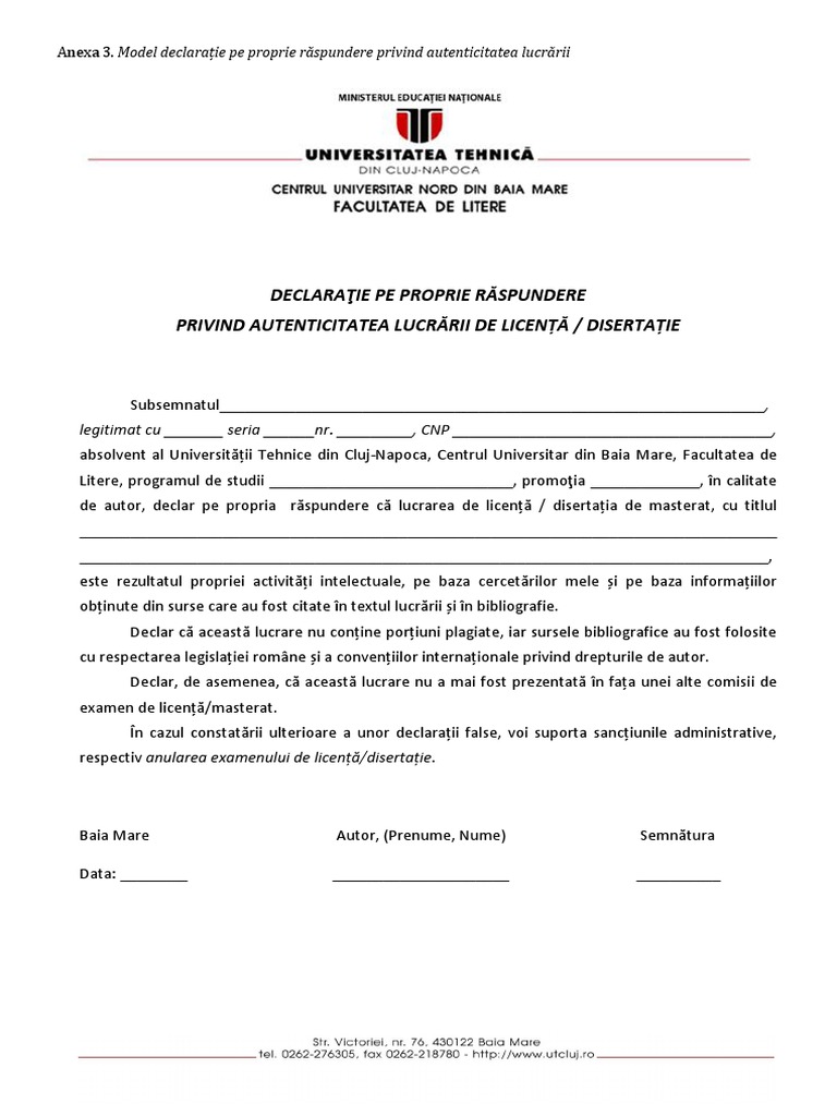 Declaraţie pe proprie răspundere privind autenticitatea lucrării de licenţă disertaţie subsemnatul. Declarația pe propria răspundere privind autenticitatea lucrării de diploma disertație. Subsemnatul garantez personal pentru autenticitatea documentelor in copie atasate. Formular f2 declaratie pe propria răspundere privind conformitatea documentelor si informațiilor prezentate in dosarul de candidatură 2 9 împotriva mea a fost declansată si se află in derulare cercetare penală privind presupuse fapte comise in activitatea mea profesională.