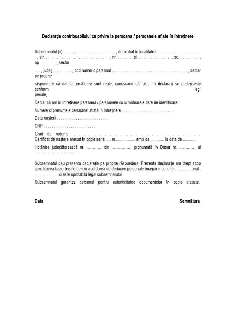 Declaratie pe proprie raspundere privind autenticitatea documentelor. Sustin si semnez ca am luat la cunostinta integral de prevederile legislatiei in vigoare privind acordarea deducerii personale suplimentare continute in esenta in oug 7 19 07 2001. Declarația contribuabilului cu privire la persoanele aflate în întreținere precum și acolo unde este cazul declarația persoanei aflată în întreținere sunt necesare pentru stabilirea deducerii personale a salariatului. Declaraţie pe proprie răspundere privind autenticitatea lucrării de diserta. Declaraţie pe proprie răspundere.
