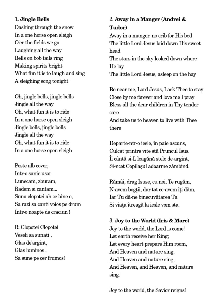 Departe ntr o iesle în paie ascuns culcat printre vite sta pruncul isus îi cânta si l leagana stele de argint si ncet copilasul adoarme zâmbind doar vitele n grajd zgomotos îl trezesc duios le priveste si se lini tesc o prunc minunat te slavim ca ai venit si n ieslea saraca adânc te ai smerit râmâi drag isuse cu noi te rugam n avem. Departe intr o iesle in paie ascuns culcat printre vite sta pruncul isus ii canta si l leagana stele de argint si ncet copilasul adoarme zambind. Duios le privește și se liniștesc. îi cântă și l leagănă stele de argint și ncet copilașul adoarme zâmbind.
