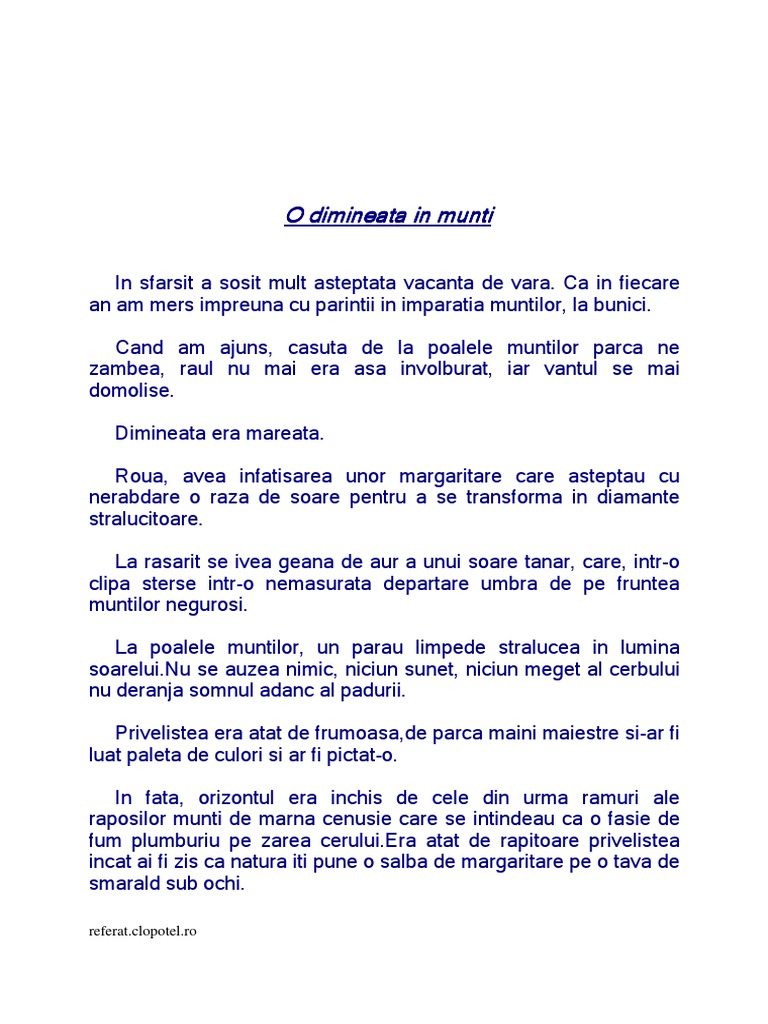 Descrierea unui peisaj de munte. Pentru somnoroasele păsărele noaptea nu e neagră şi întunecată pentru ele razele stelelor sunt ca de foc şi le luminează calea înapoi către munte. Nu este miros de flori pentru că florile dorm deja de mult într un val de argintie ceaţă cum muritorilor de rând sau păsărelelor obişnuite nu le e dat să vadă. An de an este îngropat de a binelea sub stratul gros de zăpada care cade din abundență. Descriere literara a unui munte mai jos o sa aveti mai multe rezultate pentru cautarea descriere literara a unui munte.