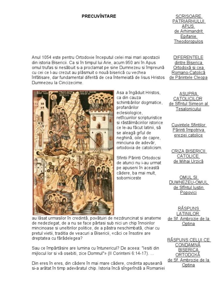 Nu exista asa ceva. Ei zic ca duhul sfant purcede si de la tatal si de la fiul aceasta greseala dogmatica este cea mai grea. Biserica romano catolica considera ca iisus s a rastignit pentru a rascumpara pacatul stramosesc savârsit de adam si eva. Diferențele dintre catolici și ortodocși.