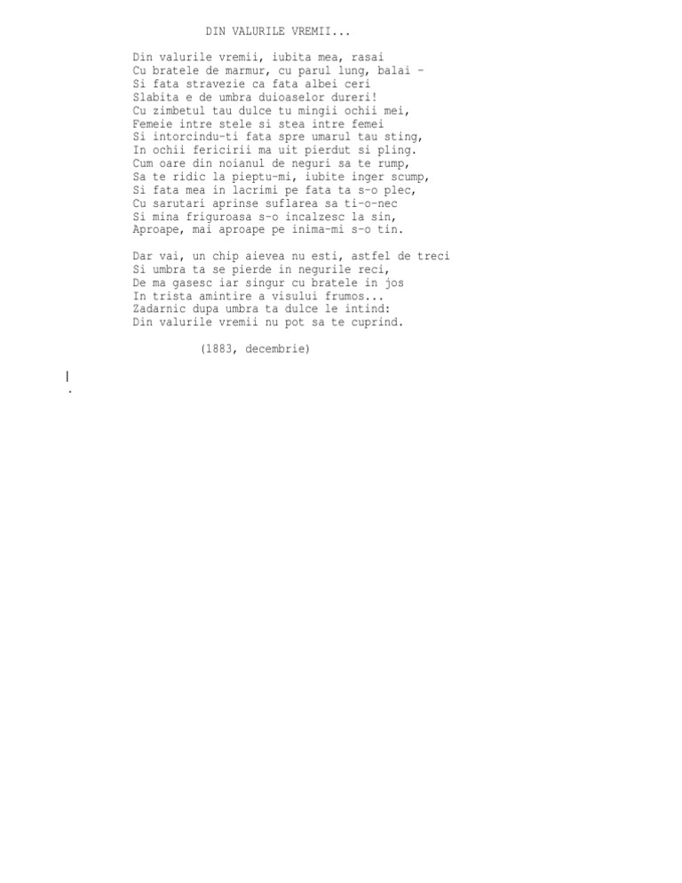 Bibliocronologie mihai eminescu 1850 1889. Din valurile vremii iubita mea rasai cu bratele de marmur cu parul lung balai si fata stravezie ca fata albei ceri slabita e de umbra duioaselor dureri. Din valurile vremii iubita mea răsari cu braţele de marmură cu părul lung bălai şi faţa străvezie ca faţa albei ceri slăbită e de umbra duioaselor dureri. I poezia ncepe cu o invocaie retoric exprimnd nevoia ndrgostitului de comunicare a ectiv de regsire a iubirii pierdute in valurile vremii iubita mea rsai.