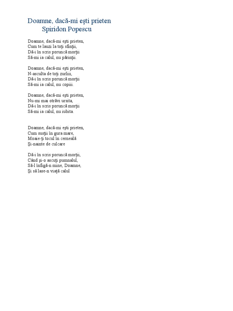 Doamne daca mi esti prieten. Doamne dacă mi eşti prieten nu mi mai otrăvi ursita dă i în scris poruncă morţii să mi ia calul nu iubita. Doamne dacă mi ești prieten nu mi mai otrăvi ursita dă i în scris poruncă morții. Să mi ia calul nu iubita. Doamne dacă mi ești prieten de spiridon popescu.