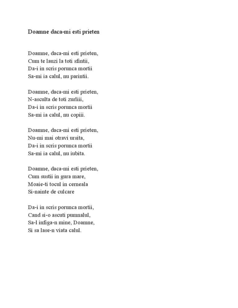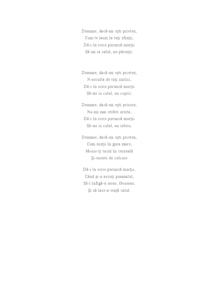 Doamne dacă mi eşti prieten nu mi mai otrăvi ursita dă i în scris poruncă morţii să mi ia calul nu iubita.