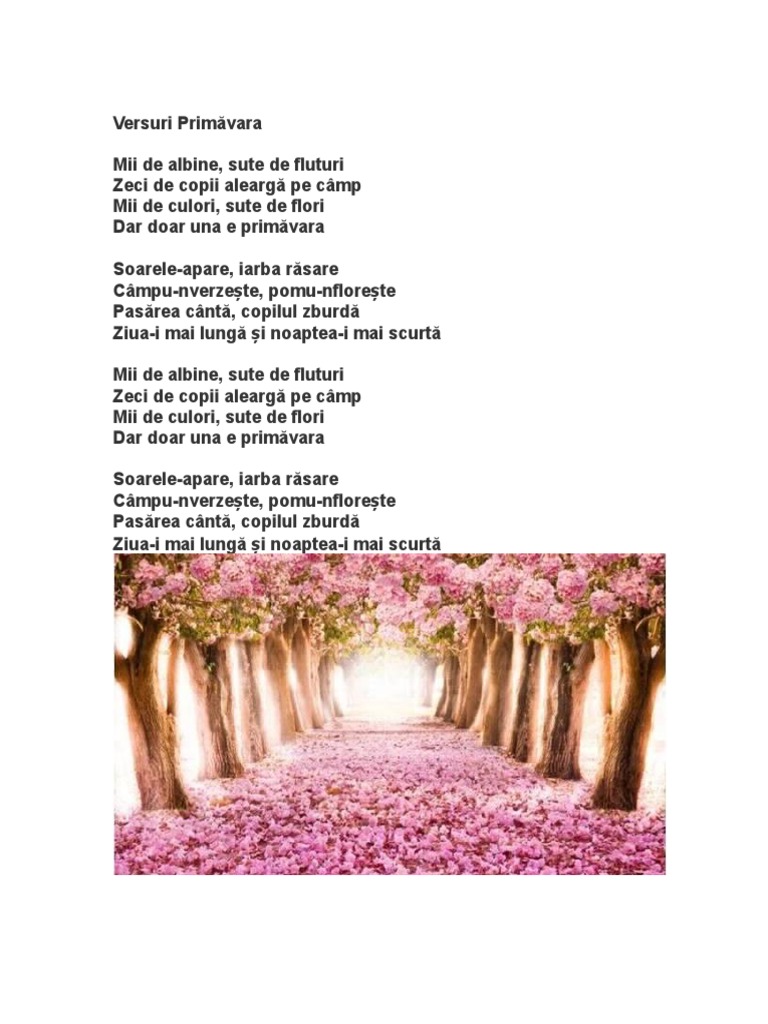 Doar una e primavara. Soarele apare iarba răsare câmpu nverzește pomu nflorește. Doar una e primavara. Pasărea cântă copilul zburdă ziua i mai lungă şi noaptea mai scurtă.