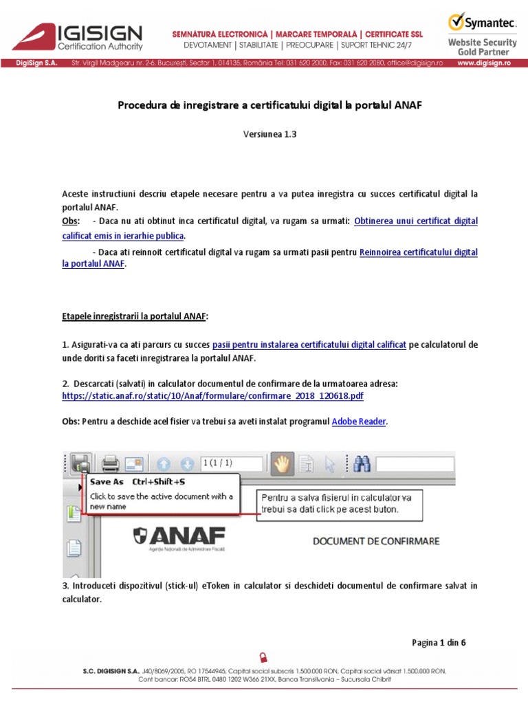 Pagina 2 din 6 4. Accesaţi portalul anaf pagina declaraţii electronice meniul reînnoire certificate calificate şi transmiteţi documentul de confirmare. Descarcă l și după ce îl semnezi electronic cu certificatul digital de la certsign încarcă l înapoi pe confirmare certsign ro. Veti primi un e mail din partea noastra anuntandu va ca noul numar al certificatului a fost introdus in baza de date a anaf.