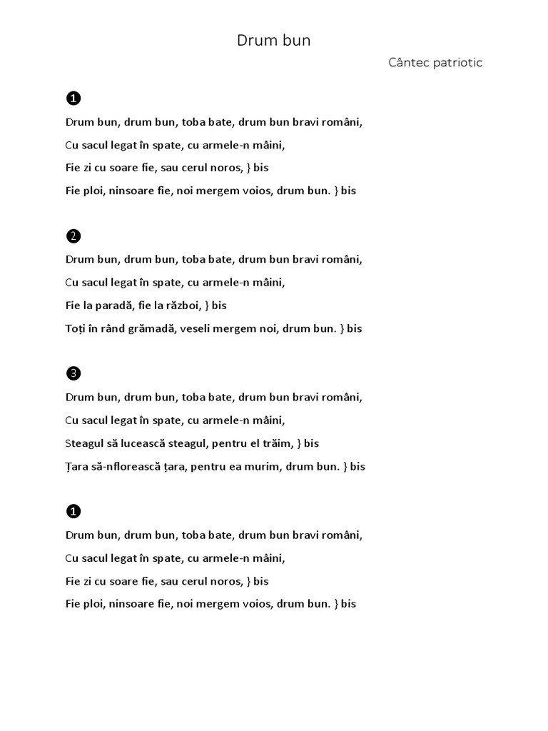 Drum bun drum bun tobă bate. Cu sacul legat în spate cu armele n mâini. Drum bun de pentru patrie drum bun drum bun toba bate drum bun bravi romani ura. Roman moldovean instrainat de patria mama. Drum bun drum bun toba bate drum bun bravi români ura super interpretare a corului de copii al cercului militar din craiova acompaniați de muzica militară a garnizoanei craiova.