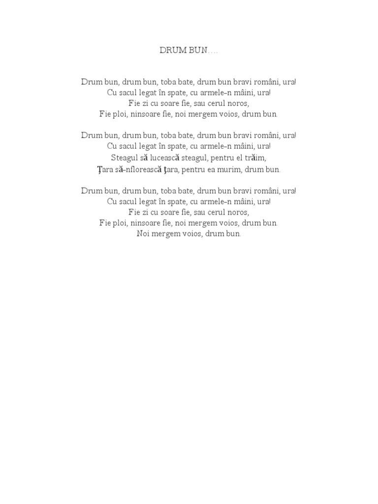 Drum bun drum bun toba bate drum bun bravi romani cu sacul legat in spate cu armele n maini fie la parada fie la razboi toti in rand gramada veseli mergem noi drum bun drum bun toba bate drum bun bravi romani cu sacul legat in spate cu armele n maini steagul sa luceasca pentru el traim tara sa n floreasca pentru ea murim. That s an understatement it should be. Farewell is a romanian march composed by ștefan nosievici in 1856. Drum bun drum bun toba bate drum bun bravi romani ura cu sacul legat in spate cu armele n maini ura fie zi cu soare fie sau cerul noros fie ploi ninsoare fie noi mergem voios drum bun x2 str 2 drum bun drum bun toba bate drum bun bravi romani ura cu sacul legat in spate cu armele n maini ura fie la parada.