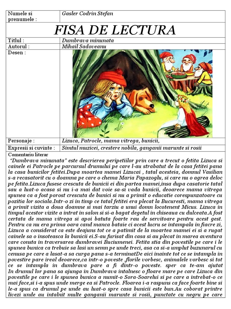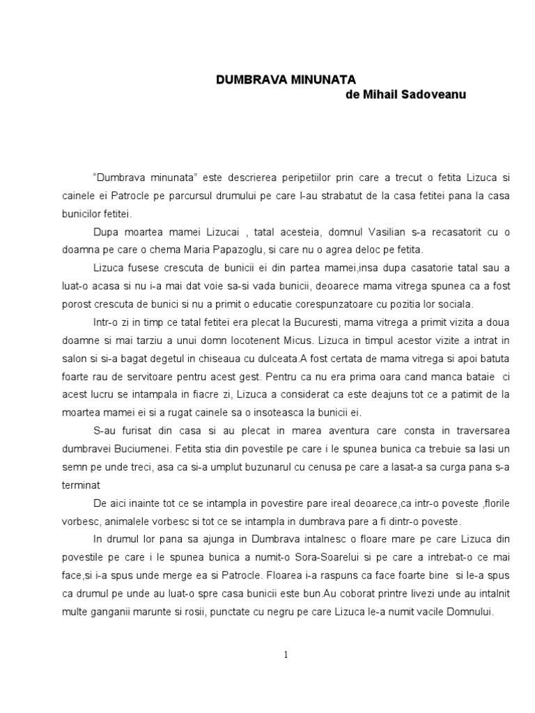6 noiembrie 1880 pașcani principatele unite d. Lizuca fusese crescută de bunicii ei dar după ce tatăl ei s a recăsătorit a. Dumbrava minunata rezumat de mihail sadovenau scrieti in comentarii titlul si autorul operelor de care aveti nevoie. Lizuca are 6 ani și este o fetiță orfană pentru că mama ei a murit.
