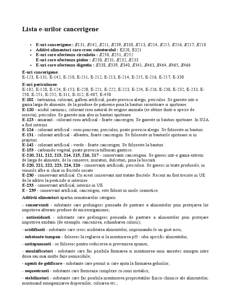 Printre cele mai periculoase e uri se numara e102 sau tartrazina un colorant galben foarte nociv care se gaseste in bauturi mustar si gem. E 200 acid sorbic e 210 acid benzoic e 211 benzoat de sodiu e 213 benzoat de calciu e 214 etil p hidroxibenzoat si e 215 etil p hidroxibenzoat de sodiu nu pot fi recunoscute decat prin teste de laborator ca toate celelalte din aceasta grupa. Aditivi interzisi si aditivi permisi. E251 nitrat de sodiu cancerigen.