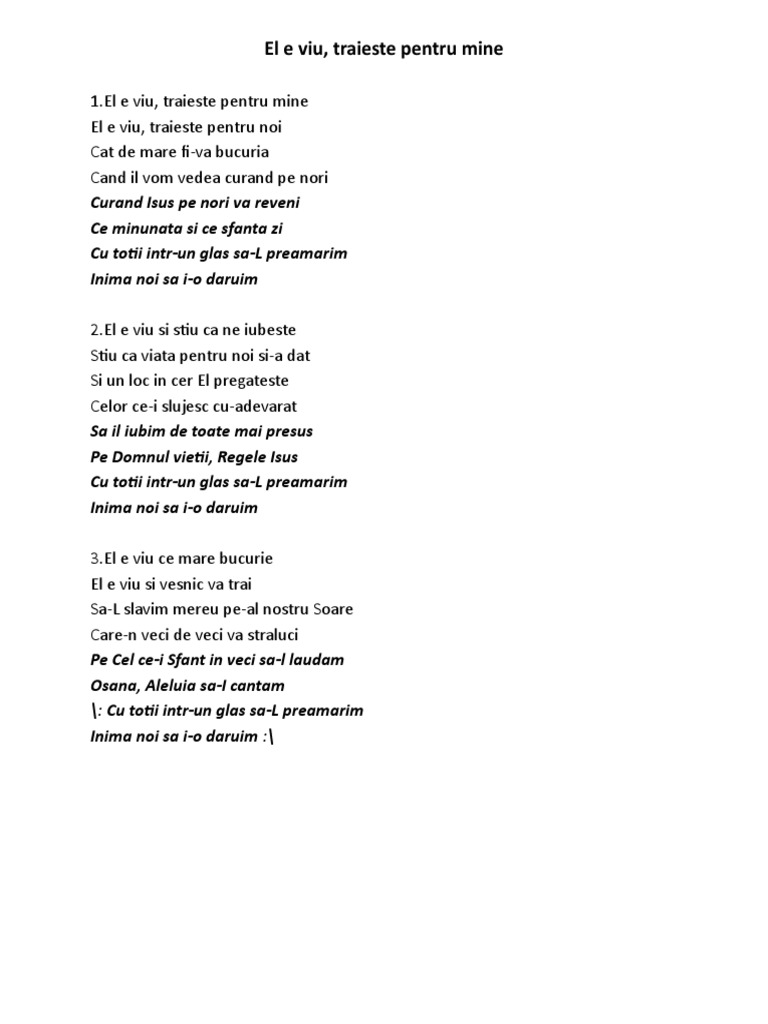 El e viu și știu că ne iubește știu că viața pentru noi şi a dat. Curand isus pe nori va reveni ce minunata si ce sfanta zi cu totii intr un glas sa l preamarim inima noi sa i o daruim. 1 el e viu traieste pentru mine el e viu traieste pentru noi cat de mare fi va bucuria cand il vom vedea curand pe nori. Si de ndata ce l vad simt inlauntrul meu cum imi bate inima.