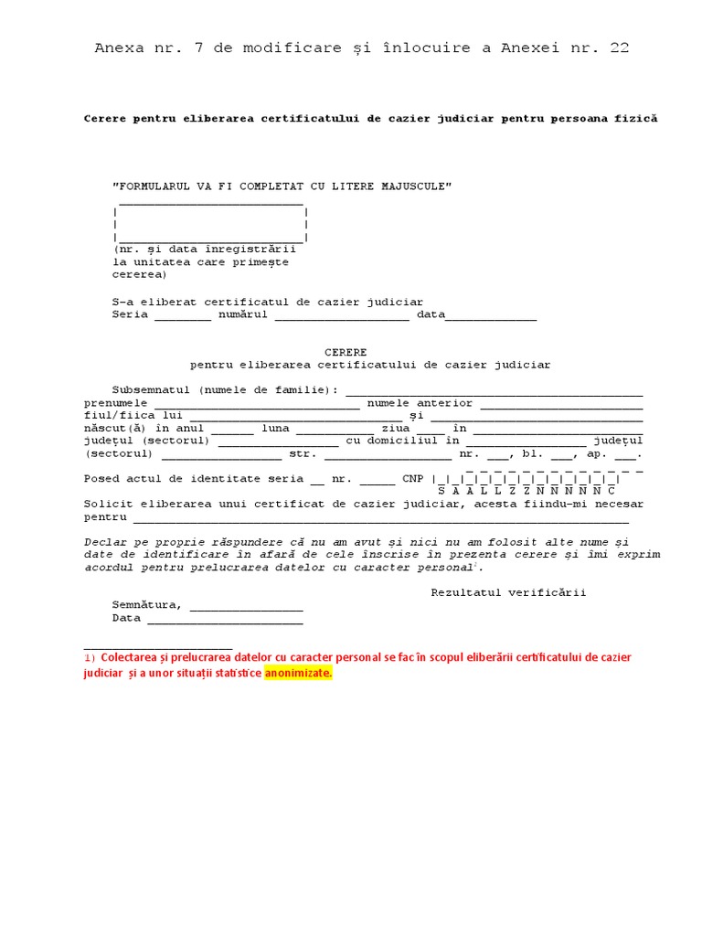 Anexa 22 cerere pentru eliberarea certificatului de cazier judiciar pentru persoana fizică formularul va fi completat cu litere majuscule nr. Hgr 188 din 30 martie 2017 privind modificarea și completarea hotărârii guvernului nr.