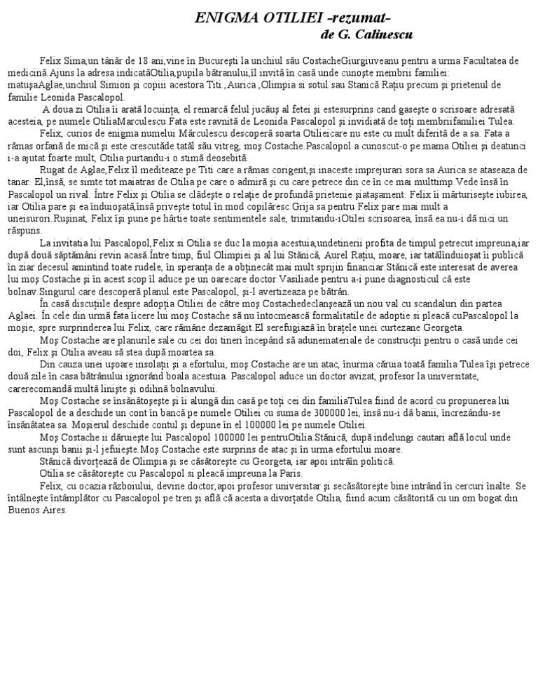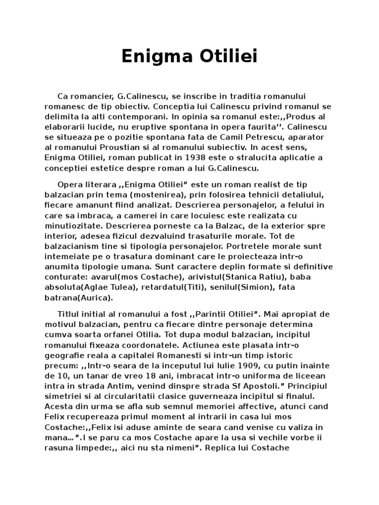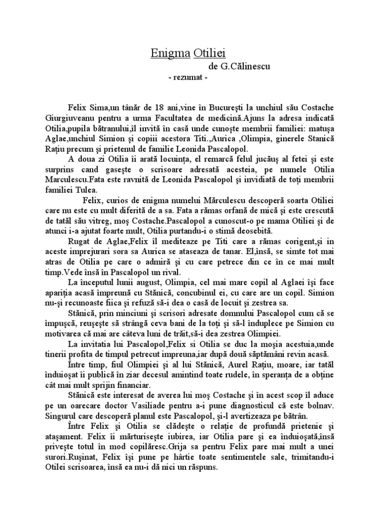 George călinescu este tipul scriitorului total critic şi istoric literar eseist şi estetician prozator şi poet dramaturg şi publicist. Enigma otilfei comentariu literar romanul realist balzacian. Puteti gasi foarte multe referate accesand categoriile din partea dreapta despre enigma otiliei rezumat pe scurt uita te mai jos si o sa gasesti cele mai relevante rezultate pentru cautarea enigma otiliei rezumat pe scurt. Romanul este o scriere epica tn proza cu actiune complexa de mare intindere desfasurata pe mai multe planuri cu personaje numeroase si cu o intriga complicata.