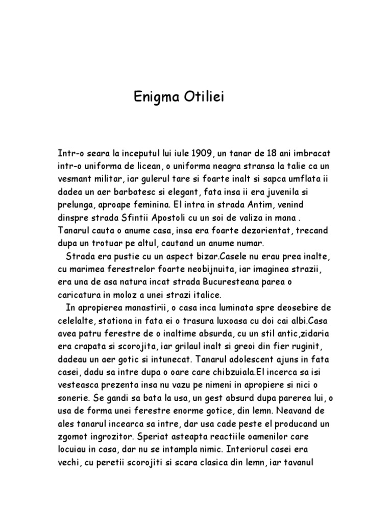 Enigma otiliei comentariu pe scurt. Povestirea pe scurt a actiunii romanului enigma otiliei de george calinescu 86513 visits povestirea pe scurt la harap alb 60165 visits. Opera sa este extrem de variată de la poezie la cea mai completă şi mai complexă istorie a literaturii române. In aceeasi perioada se remarca alti scriitori precum mihail sadoveanu sau mircea eliade. Tema romanului ilustreaz viaa burgheziei bucuretene de la nceputul.