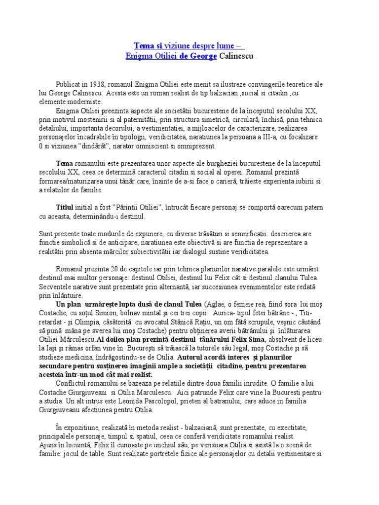 Tema şi viziunea despre lume reflectate într un roman studiat aparţinând perioadei interbelice enigma otiliei. Prin intermediul lui felix care patrunde in universul familiilor giurgiuveanu si tulea cititorul face cunostinta in maniera balzaciana cu intreg peisajul tipologiilor prozei realiste. Eseu enigma otiliei george calinescu tema şi viziunea despre lume într un roman al lui g. Enigma otiliei de george calinescu eseu.