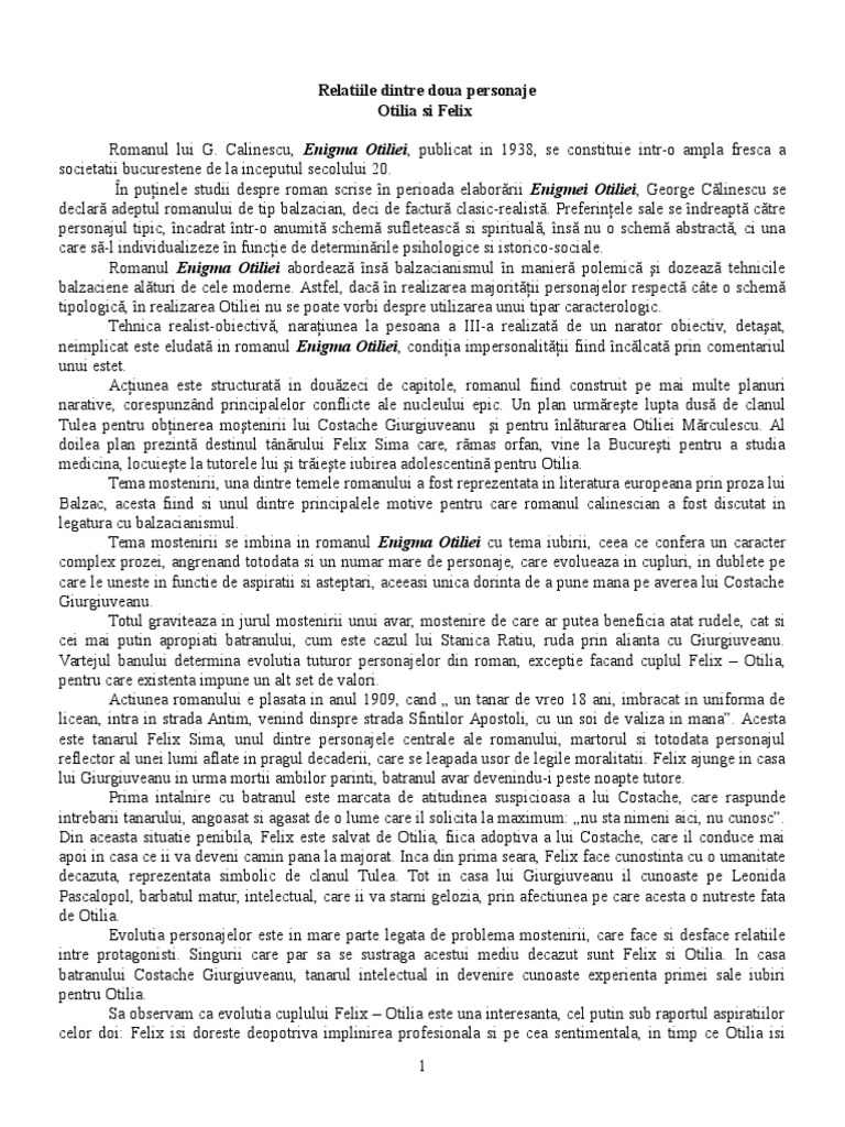 Cat mai detaliat va rog dau funditaaaaaaa si vot. în puţinele studii despre roman scrise în perioada elaborării enigmei. Urmărind relația dintre felix și otilia cele două personaje reprezentative ale romanului enigma otiliei de george călinescu își va fi mult mai ușor să înțelegi subiectul romanului și vei putea răspunde corect la cerința de la bacalaureatul la limba română din data de 29 08 2011 sesiunea august septembrie redactează un eseu de două trei pagini în care să prezinți. Referat despre enigma otiliei caracterizare otilia si felix formula balzaciana se regaseste integral in romanul lui calinescu deoarece.