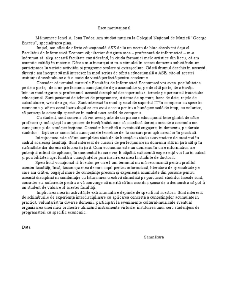 Eseu motivațional stimată comisie de evaluare subsemnata tănăsie l f. Eseul motivational este o lucrare cu o intindere cuprinsa intre 500 si 1000 de cuvinte. Admitere ase eseu motivational admitere ase 2014 admitere facultate 2014 calendar admitere 2014 pentru anul universitar 2014 2015 a fost scos examenul de admitere din cauza numarului mic de candidati de anului trecut si a fost introdus ca proba de departajare a candidatilor interviul si eseul motivational.
