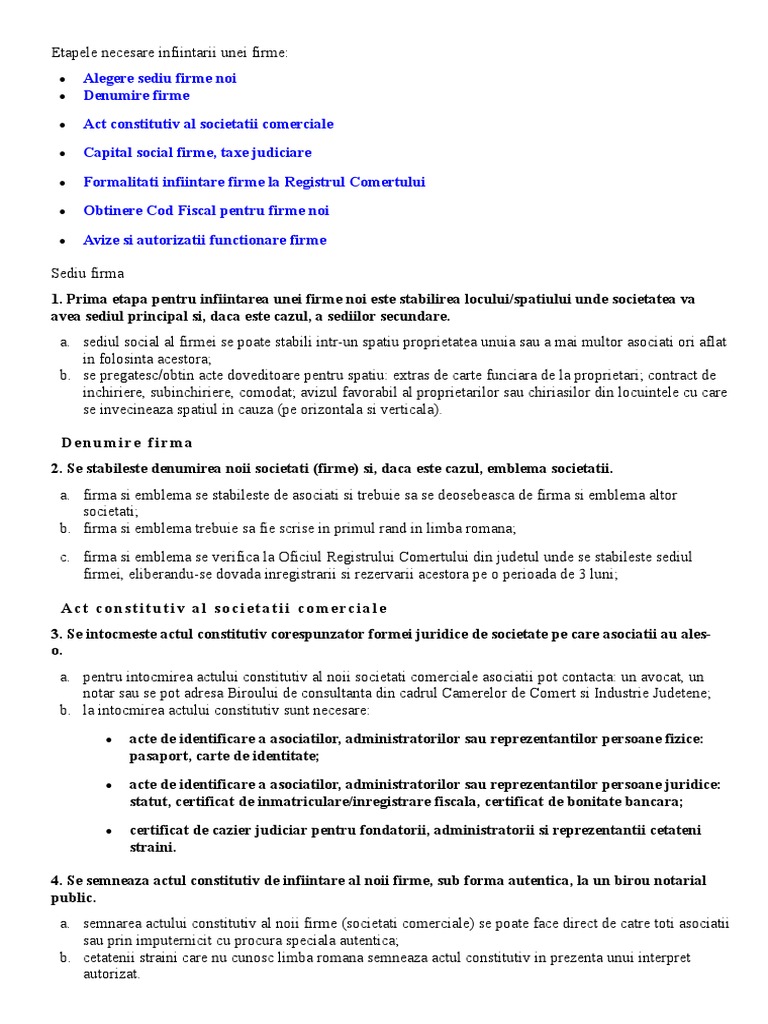 Etapele infiintarii unei firme. Actele necesare pentru infiintarea unei firme. Auditul intern in romania. Infiintarea unei companii inseamna in mod implicit alegerea unui obiect de activitate care se va realiza in conformitate cu noul cod caen din anul 2008. Modificarea membrilor organelor unei societati in romania.