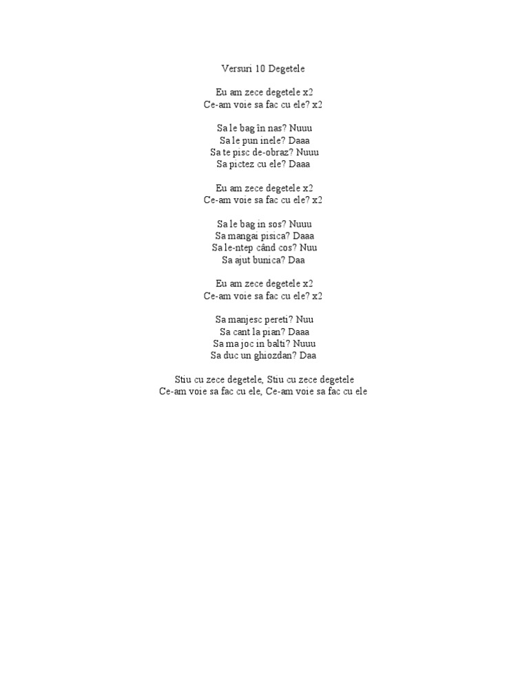 Ce am voie să fac cu ele. Sa le bag in sos. Eu am zece degețele eu am zece degețele ce am voie să fac cu ele. Versuri cantec 10 degetele.