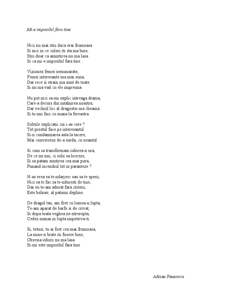 Atat de grabnic mi ai intrat in sânge atât de mult trăiești în sinea mea. Mi e dor de tine mi. Mi e imposibil fara tine de adrian paunescu luni 10 decembrie 2007. A fost cel mai bun poet al unei întregi generații a fost iubit pe scena cenaclului flacăra şi citit în zeci de reviste.
