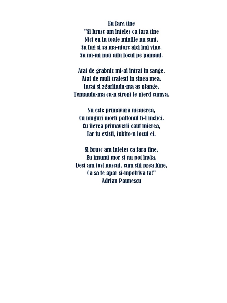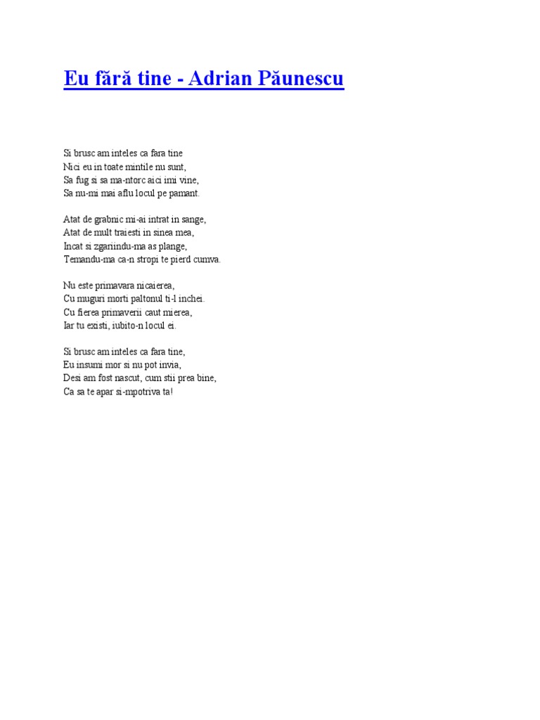 Si brusc am inteles ca fara tine eu insumi mor si nu pot invia desi am fost nascut cum stii prea bine ca sa te apar si mpotriva ta. Si brusc am inteles ca fara tine nici eu in toate mintile nu sunt sa fug si sa ma ntorc aici imi vine sa nu mi mai aflu locul pe pamant. Eu fără tine adrian păunescu publicat de unknown la 12 01. Distribuiți pe twitter distribuiți pe facebook trimiteți către pinterest.