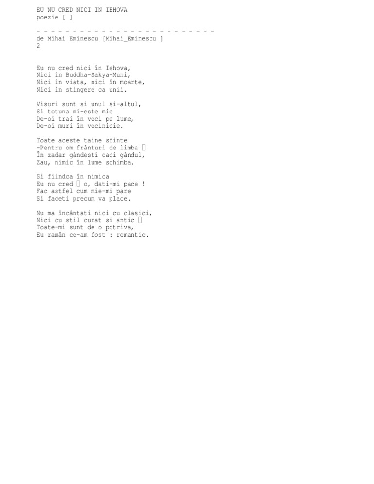 Eu nu cred nici in iehova. Toate aceste taine sfinte pentru om frânturi de limbă în zădar gândeşti căci gândul. Eu nu cred nici în iehova nici în buddha sakya muni nici în viața nici în moarte nici în stingere ca unii. Eu nu cred nici în iehova. Eu nu cred nici în iehova nici în buddha sakya muni nici în viață nici în moarte nici în stingere ca unii.