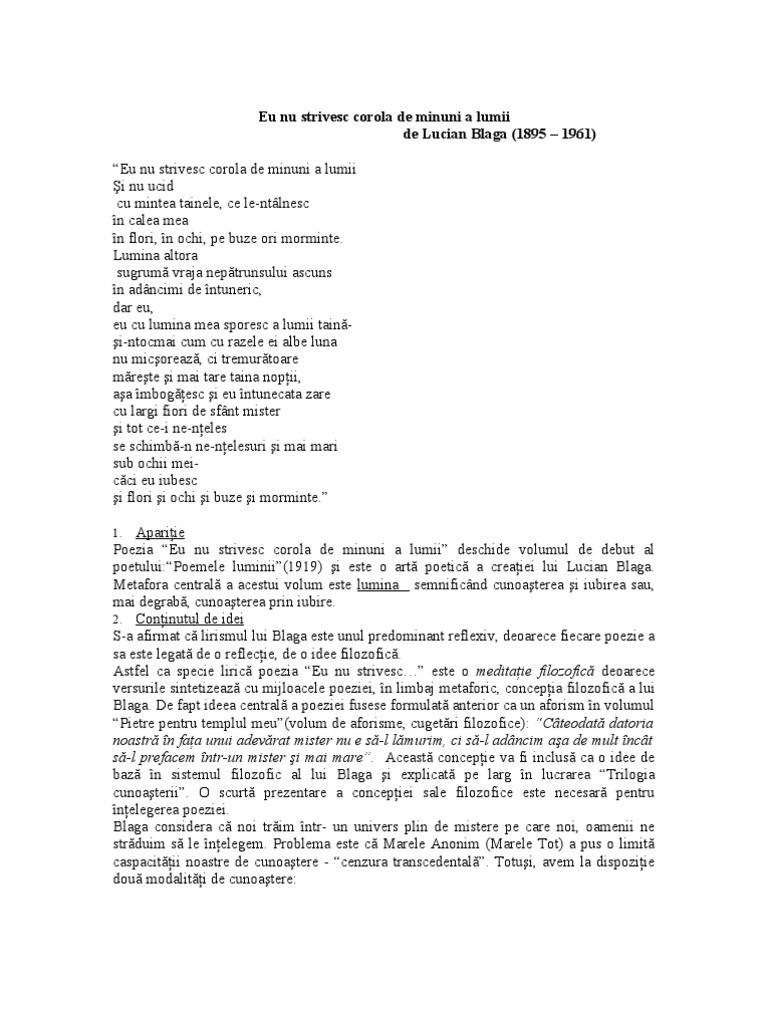 Metafora re velatorie comparaţia amplă versul liber la relaţia poet lume şi. Personalitate impunatoare si polivalenta a culturii romane interbelice lucian blaga a marcat perioada respectiva prin elemente de originalitate compatibile cu inscrierea sa la universitate. Eu nu strivesc corola de minuni a lumii comentariu bac. Lumina altora sugrumă vraja nepătrunsului ascuns în adâncimi de întuneric dar eu eu cu lumina mea sporesc a lumii taină şi ntocmai cum cu razele ei albe luna nu micşorează ci tremurătoare.