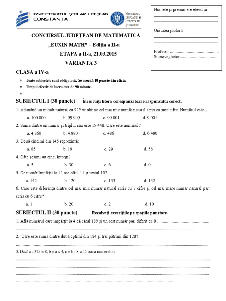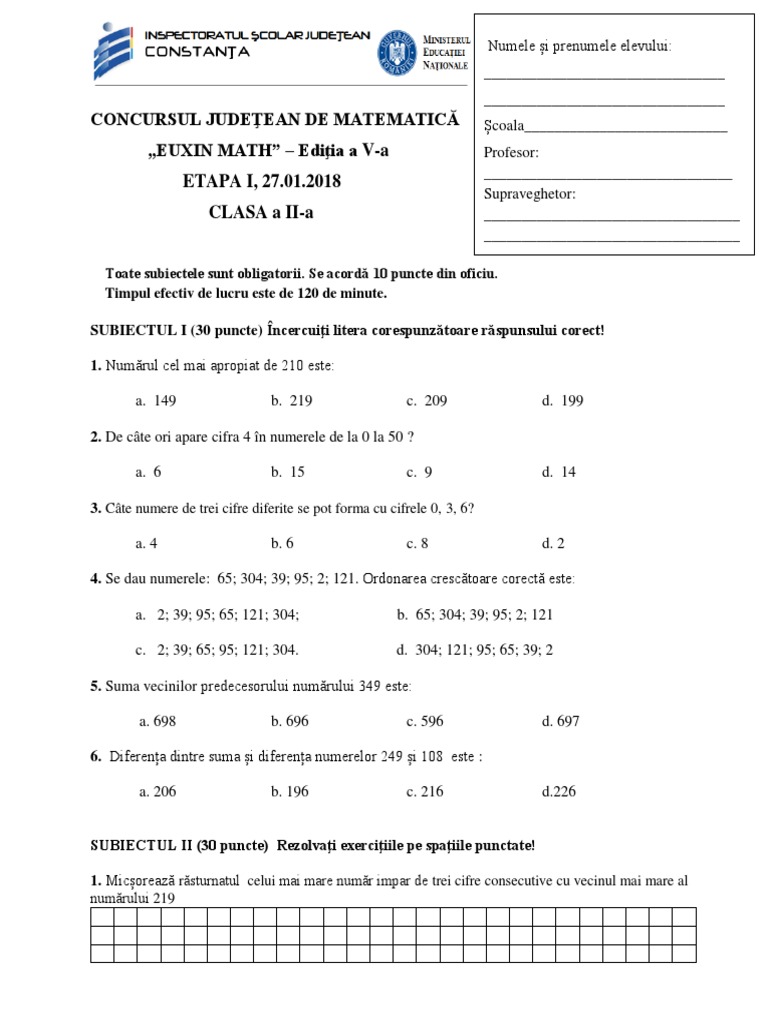 Euxin math 2018 subiecte. Numele şi prenumele elevului unitatea şcolară clasa punctaj obținut prof. Concurs de matematică la concurs participă elevii claselor a ii a a iii a a iv a din judeţul constanţa prezentare. Anul clasa a ii a clasa a iii a clasa a iv a clasa a v a clasa a vi a clasa a vii a. Concursul euxin math material didactic pentru clasa a ii a.
